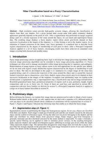 Résumé : High resolution sonars provide high-quality acoustic images, allowing the classification of objects from their cast shadow. For a given ground mine except mine with radial symmetry, shadow appearance generally depends on the point of view. After a segmentation step performed on images acquired along a part of a circular trajectory of the sonar around the object, we can match and superimpose binary data. The resulting image displays a fuzzy shadow region whose pixels grey-levels depend on their successive localisation in the images of the sequence, i.e. if they belong or not to the shadow region. As an extension of feature extraction in the binary case, fuzzy geometry is a practical tool to describe fuzzy regions characterised by the degree of membership of each pixel to them. After a Principal Component Analysis applied to a set of fuzzy features, encouraging results have been achieved on simulated sonar images covering both classical and stealthy mines.