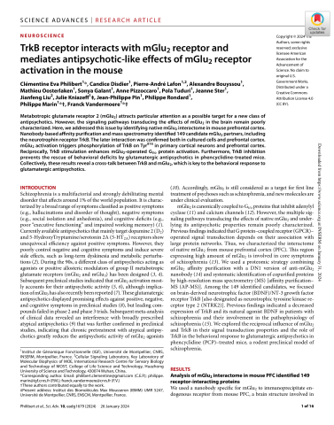 Résumé : Metabotropic glutamate receptor 2 (mGlu2) attracts particular attention as a possible target for a new class of antipsychotics. However, the signaling pathways transducing the effects of mGlu2 in the brain remain poorly characterized. Here, we addressed this issue by identifying native mGlu2 interactome in mouse prefrontal cortex. Nanobody-based affinity purification and mass spectrometry identified 149 candidate mGlu2 partners, including the neurotrophin receptor TrkB. The later interaction was confirmed both in cultured cells and prefrontal cortex. mGlu2 activation triggers phosphorylation of TrkB on Tyr816 in primary cortical neurons and prefrontal cortex. Reciprocally, TrkB stimulation enhances mGlu2-operated Gi/o protein activation. Furthermore, TrkB inhibition prevents the rescue of behavioral deficits by glutamatergic antipsychotics in phencyclidine-treated mice. Collectively, these results reveal a cross-talk between TrkB and mGlu2, which is key to the behavioral response to glutamatergic antipsychotics.