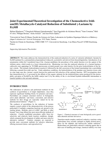 3SiH mediated by a pentamethylcyclopentadienyl iridacyclic acetonitrilo salt derived from benzo[h]quinoline. Introduction of an unsaturation within the 5-membered ring of the γ-lactam annihilates the precedence of the amide function over the capture of the silylium cation, which results in a lower chemoselectivity. Monitoring over time the catalyzed reduction of a γ-lactam bearing a carboxylic ester appendage by 1H NMR spectroscopy revealed pseudo-zero-order kinetics for the prior hydrosilylation of the lactam’s amide. This primary hydrosilylation reaction is followed by the full conversion of the formed intermediate into a pyrrolidine following a pseudo-first-order rate law. Under anhydrous conditions, the hydrosilylation of the pendant ester function occurs only in a late stage once the γ-lactam’s amide function has underwent full reduction of the carbonyl function. DFT investigations show that chemoselectivity is governed (1) by the affinity of the organic substrate for the triethylsilylium cation produced by the electrophilic activation of Et3SiH by the Ir(III) catalyst and (2) by the ability of the in situ-formed hydrido-iridium(III) intermediate to transfer hydride to the activated substrate.