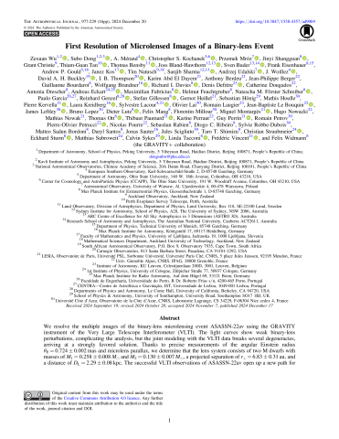 Résumé : We resolve the multiple images of the binary-lens microlensing event ASASSN-22av using the GRAVITY instrument of the Very Large Telescope Interferometer (VLTI). The light curves show weak binary-lens perturbations, complicating the analysis, but the joint modeling with the VLTI data breaks several degeneracies, arriving at a strongly favored solution. Thanks to precise measurements of the angular Einstein radius θ E = 0.724 ± 0.002 mas and microlens parallax, we determine that the lens system consists of two M dwarfs with masses of M 1 = 0.258 ± 0.008 M ⊙ and M 2 = 0.130 ± 0.007 M ⊙ , a projected separation of r ⊥ = 6.83 ± 0.31 au, and a distance of D L = 2.29 ± 0.08 kpc. The successful VLTI observations of ASASSN-22av open up a new path for studying intermediate-separation (i.e., a few astronomical units) stellar-mass binaries, including those containing dark compact objects such as neutron stars and stellar-mass black holes.