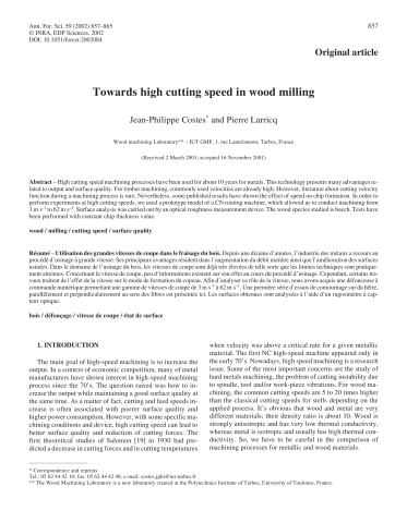 Résumé : High cutting speed machining processes have been used for about 10 years for metals. This technology presents many advantages related to output and surface quality. For timber machining, commonly used velocities are already high. However, literature about cutting velocity function during a machining process is rare. Nevertheless, some published results have shown the effect of speed on chip formation. In order to perform experiments at high cutting speeds, we used a prototype model of a CN routing machine, which allowed us to conduct machining from 3 m s$^{-1}$ to 62 m s$^{-1}$. Surface analysis was carried out by an optical roughness measurement device. The wood species studied is beech. Tests have been performed with constant chip thickness value.