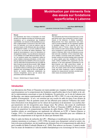 Résumé : Les laboratoires des Ponts et Chaussées ont mené pendant une vingtaine d'années de nombreuses expérimentations sur le comportement des fondations superficielles. Les mesures ont été exploitées pour justifier la réglementation concernant le calcul des fondations. En particulier, sur le site de Labenne, près de quarante essais ont été effectués dans des conditions de chargement variées. Le sol est constitué de sable de dune sur une dizaine de mètres d'épaisseur. Des essais de reconnaissance in situ et en laboratoire ont été également réalisés. Tous les éléments nécessaires à une validation de modèle éléments étaient donc réunis. Les quatorze essais sous chargement vertical et centré, réalisés à diverses profondeurs, ont été modélisés par éléments finis (CÉSAR-LCPC) et le comportement du sable décrit successivement par le modèle de Mohr-Coulomb et celui de Nova (version 1982). Malgré certaines difficultés numériques, qui ont été résolues, les résultats obtenus confirment que le modèle élastoplastique avec écrouissage de Nova est capable de décrire de manière relativement satisfaisante les mesures enregistrées, pourvu que les valeurs des paramètres soient bien déterminées.