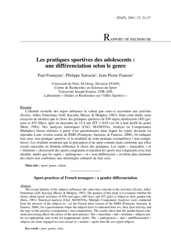 Résumé : L'identité sexuelle des sujets influence la valeur que ceux-ci accordent aux activités (Eccles, Adler, Futterman, Goff, Kaczala, Meece, & Midgley, 1983). Dans cette étude, nous essayons de montrer que le choix des pratiques sportives de 858 sujets adolescents (403 garçons et 455 filles), âgés en moyenne de 15.4 ans (ET = 0.83) est lié à leur profil de genre (Bem, 1981). Des analyses statistiques (Chi2, MANOVAs, Analyse en Composantes Multiples) furent réalisées à partir d'un questionnaire dans lequel les sujets devaient (a) répondre à une version courte du BSRI (Fontayne, Sarrazin, & Famose, 2000), (b) indiquer leur sexe, leur pratique sportive, et la modalité de cette pratique (compétitive / non-compétitive). Les résultats montrent que la perception d'un sport comme étant conforme aux rôles sexués masculin ou féminin influence le choix des pratiques. Les sujets «masculins» et «féminins» choisissent des sports congruents et rejettent les sports non congruents avec leur identité, tandis que les sujets «androgynes» et «non-différenciés» révèlent plus aisément des choix non conformes aux stéréotypes culturels de leur sexe.