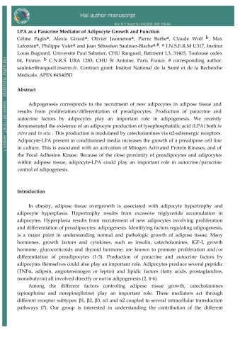 Résumé : Adipogenesis corresponds to the recruitment of new adipocytes in adipose tissue, and results from the proliferation/differentiation of preadipocytes. Production of paracrine and autocrine factors by adipocytes plays an important role in adipogenesis. We recently demonstrated the existence of adipocyte production of lysophosphatidic acid (LPA) both in vitro and in situ. This production is modulated by catecholamines via alpha 2-adrenergic receptors. Adipocyte-LPA present in conditioned media increases the growth of a preadipose cell line in culture. This growth is associated with an activation of mitogen-activated protein kinases, and of the focal adhesion kinase. Because of the close proximity of preadipocytes and adipocytes within adipose tissue, adipocyte-LPA could play an important role in autocrine/paracrine control of adipogenesis.
