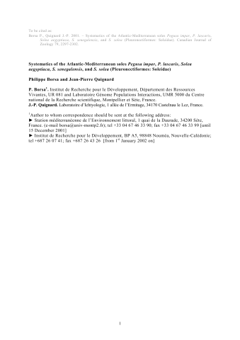 Résumé : Nucleotide sequence variation at the cytochrome b locus was investigated in five Solea species, together with a reappraisal of meristic data and a review of allozyme data pertinent to their systematics. S. aegyptiaca, considered a synonym of S. solea, and S. (Pegusa) impar, considered a synonym of S. (P.) lascaris, are shown to be valid species according to the morphological, phylogenetic, genotypic, and biological species definitions. The validity of the genus Pegusa was examined in the light of both allozyme and cytochrome b gene sequence data.