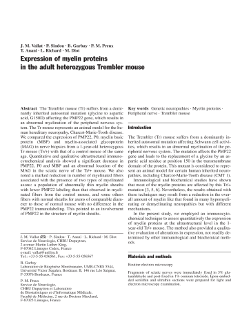 Résumé : The Trembler mouse (Tr) suffers from a dominantly inherited autosomal mutation (glycine to aspartic acid. G150D) affecting the PMP22 gene, which results in an abnormal myelination of the peripheral nervous system. The Tr mouse represents an animal model for the human hereditary neuropathy, Charcot-Marie-Tooth disease. We compared the expression of PMP22, P0, myelin basic protein (MBP) and myelin-associated glycoprotein (MAG) in nerve biopsies from a 1-year-old heterozygous Tr mouse (Tr/+) with that of a control mouse of the same age. Quantitative and qualitative ultrastructural immunocytochemical analysis showed a significant decrease in PMP22, P0 and MBP and an abnormal location of the MAG in the sciatic nerve of the Tr/+ mouse. We also noted a marked reduction in number of myelinated fibers associated with the presence of two types of myelinated axons: a population of abnormally thin myelin sheaths with lower PMP22 labeling than that observed in myelinated fibers from the control mouse, and some others fibers with normal sheaths for axons of comparable diameter to those of normal mouse with no difference in the PMP22 immunolabeling. This pointed to an involvement of PMP22 in the structure of myelin sheaths.