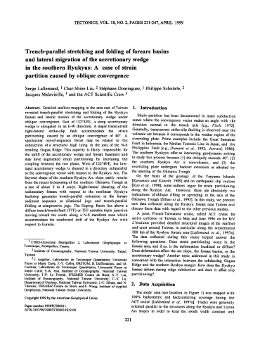 Résumé : Detailed seafloor mapping in the area east of Taiwan revealed trench-parallel stretching and folding of the Ryukyu forearc and lateral motion of the accretionary wedge under oblique convergence. East of 122ø40'E, a steep accretionary wedge is elongated in an E-W direction. A major transcurrent right-lateral strike-slip fault accommodates the strain partitioning caused by an oblique convergence of 40 ø. A spectacular out-of-sequence thrust may be related to the subduction of a structural high lying in the axis of the N-S trending Gagua Ridge. This asperity is likely responsible for the uplift of the accretionary wedge and forearc basement and may have augmented strain partitioning by increasing the coupling between the two plates. West of 122ø40'E, the low-taper accretionary wedge is sheared in a direction subparallel to the convergence vector with respect to the Ryukyu Arc. The bayonet shape of the southern Ryukyu Arc slope partly results from the recent (re)opening of the southern Okinawa Trough at a rate of about 2 to 4 cm/yr. Right-lateral shearing of the sedimentary forearc with respect to the nonlinear Ryukyu backstop generates trench-parallel extension in the forearc sediment sequence at dilational jogs and trench-parallel folding at compressive jogs. The Hoping Basin lies above a diffuse trench/trench/fault (TTF) or TFF unstable triple junction moving toward the south along a N-S transform zone which accommodates the southward drift of the Ryukyu Arc with respect to Eurasia.