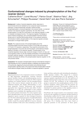 Résumé : Background: A variety of bacterial adaptative cellular responses to environmental stimuli are mediated by two-component signal transduction pathways. In these phosphorelay cascades, histidine kinases transphosphorylate a conserved aspartate in the receiver domain, a conserved module in the response regulator superfamily. The main effect of this phosphorylation is to alter the conformation of the response regulator in order to modulate its biological function. The response regulator FixJ displays a typical modular arrangement, with a phosphorylatable N-terminal receiver domain and a C-terminal DNA-binding domain. In the symbiotic bacterium Sinorhizobium meliloti, phosphorylation of this response regulator activates transcription of nitrogen-fixation genes. Results: The crystal structures of the phosphorylated and of the unphosphorylated N-terminal receiver domain of FixJ (FixJN) were solved at 2.3 Å and 2.4 Å resolution, respectively. They reveal the environment of the phosphoaspartate in the active site and the specific conformational changes leading to activation of the response regulator. Phosphorylation of the conserved aspartate induces major structural changes in the β4-α4 loop, and in the signaling surface α4-β5 that mediates dimerization of the phosphorylated full-length response regulator. A site-directed mutant at this protein-protein interface decreases the affinity of the phosphorylated response regulator for the fixK promoter tenfold. Conclusions: The cascade of phosphorylation-induced conformational changes in FixJN illustrates the role of conserved residues in stabilizing the phosphoryl group in the active site, triggering the structural transition and achieving the post-phosphorylation signaling events. We propose that these phosphorylation-induced conformational changes underly the activation of response regulators in general.