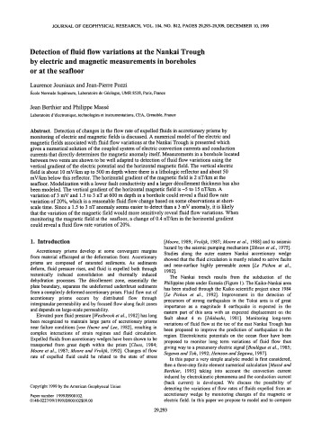 Résumé : Detection of changes in the flow rate of expelled fluids in accretionary prisms by monitoring of electric and magnetic fields is discussed. A numerical model of the electric and magnetic fields associated with fluid flow variations at the Nankai Trough is presented which gives a numerical solution of the coupled system of electric convection currents and conduction currents that directly determines the magnetic anomaly itself. Measurements in a borehole located between two vents are shown to be well adapted to detection of fluid flow variations using the vertical gradient of the electric potential and the horizontal magnetic field. The vertical electric field is about 10 mV/km up to 500 m depth where there is a lithologic reflector and about 50 mV/km below this reflector. The horizontal gradient of the magnetic field is 2 nT/km at the seafloor. Modelization with a lower fault conductivity and a larger décollement thickness has also been modeled. The vertical gradient of the horizontal magnetic field is ~5 to 15 nT/km. A variation of 3 mV and 1.5 to 3 nT at 600 m depth in a borehole could reveal a fluid flow rate variation of 20%, which is a reasonable fluid flow change based on some observations at short-scale time. Since a 1.5 to 3 nT anomaly seems easier to detect than a 3 mV anomaly, it is likely that the variation of the magnetic field would more sensitively reveal fluid flow variations. When monitoring the magnetic field at the seafloor, a change of 0.4 nT/km in the horizontal gradient could reveal a fluid flow rate variation of 20%.