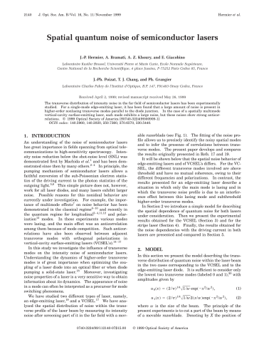 Résumé : The transverse distribution of intensity noise in the far field of semiconductor lasers has been experimentally studied. For a single-mode edge-emitting laser, it has been found that a large amount of noise is present in higher-order nonlasing transverse modes parallel to the diode junction. In the case of a spatially multimode vertical-cavity surface-emitting laser, each mode exhibits a large noise, but these noises show strong anticorrelations.