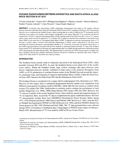 Résumé : Accelerator mass spectrometry (AMS) radiocarbon measurements were made on 120 samples collected between Antarctica and South Africa along 30°E during the WOCE-France CIVA 1 campaign in February 1993. Our principal objective was to complement the Southern Ocean's sparse existing data set in order to improve the 14C benchmark used for validating ocean carbon-cycle models, which disagree considerably in this region. Measured 14C is consistent with the 0-S characteristics of CIVA1. Antarctic Intermediate Water (AAIW) forming north of the Polar Front (PF) is rich in'4C, whereas surface waters south of the PF are depleted in 14C. A distinct old 14C signal was found for the contribution of the Pacific Deep Water (PDW) to the return flow of Circumpolar Deep Waters (CDW). Comparison to previous measurements shows a 4C decrease in surface waters, consistent with northward displacement of surface waters, replacement by old deep waters upwelled at the Antarctic Divergence, and atmospheric decline in 14C. Conversely, an increase was found in deeper layers, in the AAIW. Large uncertainties, associated with previous methods for separating natural and bomb 14C when in the Southern Ocean south of 45°S, motivated us to develop a new approach that relies on a simple mixing model and on chlorofluorocarbon (CFC) measurements also taken during CIVA1. This approach leads to inventories for CIVA1 that are equal to or higher than those calculated with previous methods. Differences between old and new methods are especially high south of approximately 55°S, where bomb 14C inventories are relatively modest.