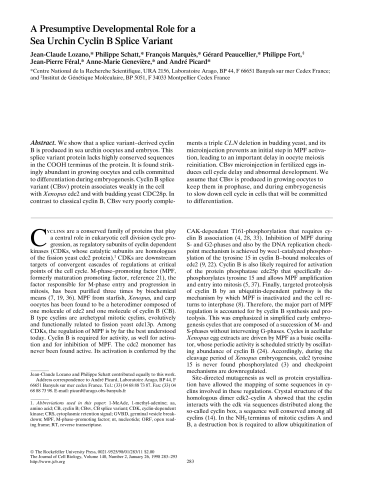 Résumé : We show that a splice variant-derived cyclin B is produced in sea urchin oocytes and embryos. This splice variant protein lacks highly conserved sequences in the COOH terminus of the protein. It is found strikingly abundant in growing oocytes and cells committed to differentiation during embryogenesis. Cyclin B splice variant (CBsv) protein associates weakly in the cell with Xenopus cdc2 and with budding yeast CDC28p. In contrast to classical cyclin B, CBsv very poorly complements a triple CLN deletion in budding yeast, and its microinjection prevents an initial step in MPF activation, leading to an important delay in oocyte meiosis reinitiation. CBsv microinjection in fertilized eggs induces cell cycle delay and abnormal development. We assume that CBsv is produced in growing oocytes to keep them in prophase, and during embryogenesis to slow down cell cycle in cells that will be committed to differentiation.