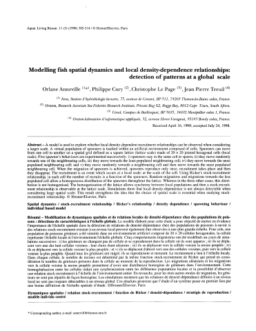 Résumé : A model is used to explore whether local density-dependent recruitment relationships can be observed when considering a larger scale. A virtual population of spawners is tracked within an artificial environment composed of cells. Spawners can move from one cell to another on a spatial grid defined as a square lattice (lattice scale) made of 20 x 20 jointed hexagonal cells (local scale). Five spawner's behaviours are experimented successively: i) spawners stay in the same cell to spawn; ii) they move randomly towards one of the neighbouring cells; iii) they move towards the least populated neighbouring cell; iv) they move towards the most populated neighbouring cell; and v) they move randomly towards a neighbouring cell and then move towards the most populated neighbouring cell. When the migration of spawners is achieved, spawners reproduce only once, recruitment takes place and then they disappear. The recruitment is an event which occurs at a local scale: at the scale of the cell. Using Ricker's stock-recruitment relationship, in each cell the number of recruits is a function of the spawners. Random migrations and migrations towards the less populated cell allow a homogeneous distribution of the spawners throughout the lattice. Whereas in the three other cases, this distribution is not homogenised. The homogenisation of the lattice allows synchrony between local populations and then a stock-recruitment relationship is observable at the lattice scale. Simulations show that local density-dependence is not always detectable when considering large spatial scale. This result strengthens the idea that the choice of spatial scale is essential when studying stockrecruitment relationship.