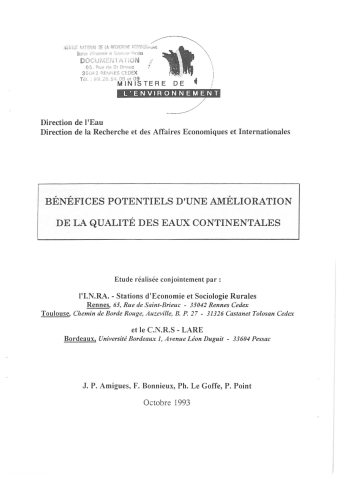 Résumé : L'objet de ce rapport est de présenter les travaux les plus récents, menés dans le domaine de l'évaluation économique de la qualité des eaux. Il contient une typologie des fonctions et usages de l'eau croisée avec les catégories de bénéfices, un exposé méthodologique, une synthèse des évaluations disponibles en France et à l'étranger (Europe et États-Unis).