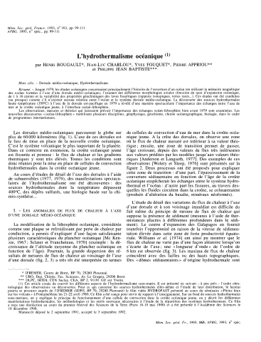 Résumé : Mots cles.-Dorsale medio-oceanique, Hydrothermalisme. Resume.-Jusque 1979, les etudes oceaniques concernaient principalement l'histoire de l'ouverture d'un ocean (en utilisant la memoire magn£tique des roches formees a l'axe d'une dorsale medio-oc6anique), l'examen des differentes morphologies axiales (fonction du taux d'expansion oceanique, de 1 a 18 cm/an) et la variabilite des proprietes geochimiques des laves basaltiques (rapports isotopiques, terres rares...). Ces etudes ont ete conduites (ou presque) comme s'il n'existait aucune relation entre l'ocean et le systeme dorsale medio-oceanique. La decouverte des sources hydrothermales haute temperature (350°C) a l'axe de la dorsale est-pacifique en 1979 a revele d'une maniere spectaculaire l'importance des echanges entre l'eau de mer et la croflte oceanique jeune, a l'interface ocean-lithosphere. Les observations, mesures et theories qui laissaient prevoir l'importance des echanges ocean-lithosphere bien avant 1979 sont examinees. Les nouvelles decouvertes « ocean-lithosphere » mobilisent plusieurs disciplines, geophysique, geochimie, chimie oceanographique, biologie, dans le cadre de programmes internationaux.