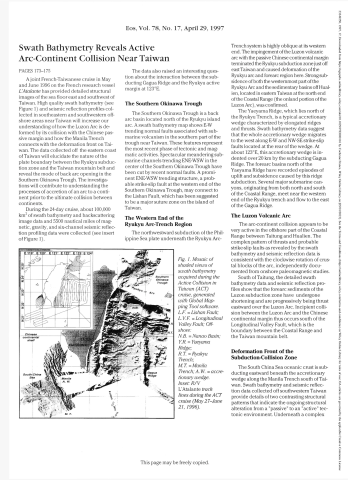 EoS Transactions - 2011 - - Swath bathymetry reveals active arc‐continent collision near Taiwan.pdf
