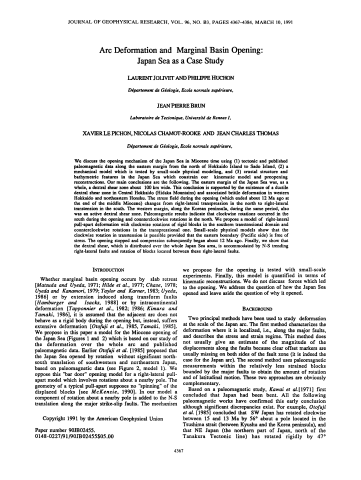 Résumé : We discuss the opening mechanism of the Japan Sea in Miocene time using (1) tectonic and published paleomagnetic data along the eastern margin from the north of Hokkaido Island to Sado Island, (2) a mechanical model which is tested by small-scale physical modeling, and (3) crustal structure and bathymetric features in the Japan Sea which constrain our kinematic model and preopening reconstructions. Our main conclusions are the following. The eastern margin of the Japan Sea was, as a whole, a dextral shear zone about 100 km wide. This conclusion is supported by the existence of a ductile dextral shear zone in Central Hokkaido (Hidaka Mountains) and associated brittle deformation in western Hokkaido and northeastern Honshu. The stress field during the opening (which ended about 12 Ma ago at the end of the middle Miocene) changes from right-lateral transpression in the north to right-lateral transtension in the south. The western margin, along the Korean peninsula, during the same period, also was an active dextral shear zone. Paleomagnetic results indicate that clockwise rotations occurred in the south during the opening and counterclockwise rotations in the north. We propose a model of right-lateral pull-apart deformation with clockwise rotations of rigid blocks in the southern transtensional domain and counterclockwise rotations in the transpressional one. Small-scale physical models show that the clockwise rotation in transtension is possible provided that the eastern boundary (Pacific side) is free of stress. The opening stopped and compression subsequently began about 12 Ma ago. Finally, we show that the dextral shear, which is distributed over the whole Japan Sea area, is accommodated by N-S trending right-lateral faults and rotation of blocks located between these right-lateral faults.