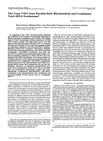 VASl structural gene indicates the existence of two classes of transcripts initiating at distinct in-frame translation start codons. The longer class of VASl transcripts initiates upstream of both ATG codons located 138 base pairs away and the shorter class downstream of the first ATG. A mutation that destroys the first AUG on the long message results in respiratory deficiency but does not affect viability. Mutation of the ATG at position 139 leads to lethality because the initiating methionine codon of the essential cytoplasmic valyl-tRNA synthetase has been destroyed. N-terminal protein sequence data further confirm translation initiation at ATG-139 for the cytoplasmic valyl-tRNA synthetase. From these results, we conclude that the VASl single gene encodes both mitochondrial and cytoplasmic valyl-tRNA synthetases. The presequence of the mitochondrial valyl-tRNA synthetase shows amino acid composition but not the amphiphilic character of imported mitochondrial proteins. From mutagenesis of the ATG-139 we conclude that the presequence specifically targets the cytoplasmically synthesized mitochondrial valyl-tRNA synthetase to the mitochondrial outer membrane and prevents binding of the enzyme core to cytoplasmic tRNAV"'.