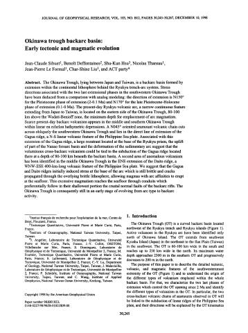 Résumé : The Okinawa Trough, lying between Japan and Taiwan, is a backarc basin formed by extension within the continental lithosphere behind the Ryukyu trench-arc system. Stress directions associated with the two last extensional phases in the southwestern Okinawa Trough have been deduced from a comparison with analog modeling: the direction of extension is N150° for the Pleistocene phase of extension (2–0.1 Ma) and N170° for the late Pleistocene-Holocene phase of extension (0.1–0 Ma). The present-day Ryukyu volcanic arc, a narrow continuous feature extending from Japan to Taiwan, is located on the eastern side of the Okinawa Trough, 80–100 km above the Wadati-Benioff zone, the minimum depth for emplacement of arc magmatism. Scarce present-day backarc volcanism appears in the middle and southern Okinawa Trough within linear en echelon bathymetric depressions. A N045° oriented seamount volcanic chain cuts across obliquely the southwestern Okinawa Trough and lies in the direct line of extension of the Gagua ridge, a N-S linear volcanic feature of the Philippine Sea plate. Associated with this extension of the Gagua ridge, a large reentrant located at the base of the Ryukyu prism, the uplift of part of the Nanao forearc basin and the deformation of the sedimentary arc suggest that the voluminous cross-backarc volcanism could be tied to the subduction of the Gagua ridge located there at a depth of 80–100 km beneath the backarc basin. A second area of anomalous volcanism has been identified in the middle Okinawa Trough in the ENE extension of the Daito ridge, a WNW-ESE 400-km-long volcanic feature of the Philippine Sea plate. We suggest that the Gagua and Daito ridges initially induced stress at the base of the arc which is still brittle and cracks propagated through the overlying brittle lithosphere, allowing magmas with arc affinities to erupt at the seafloor. This excessive magmatism reaches the seafloor through conduits which preferentially follow in their shallowest portion the crustal normal faults of the backarc rifts. The Okinawa Trough is consequently still in an early stage of evolving from arc type to backarc activity.