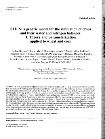 Résumé : STICS (Simulateur mulTIdiscplinaire pour les Cultures Standard) is a crop model constructed as a simulation tool capable of working under agricultural conditions. Outputs comprise the production (amount and quality) and the environment. Inputs take into account the climate, the soil and the cropping system. STICS is presented as a model exhibiting the following qualities: robustness, an easy access to inputs and an uncomplicated future evolution thanks to a modular (easy adaptation to various types of plant) nature and generic. However, STICS is not an entirely new model since most parts use classic formalisms or stem from existing models. The main simulated processes are the growth, the development of the crop and the water and nitrogenous balance of the soil-crop system. The seven modules of STICS - development, shoot growth, yield components, root growth, water balance, thermal environment and nitrogen balance - are presented in turn with a discussion about the theoretical choices in comparison to other models. These choices should render the model capable of exhibiting the announced qualities in classic environmental contexts. However, because some processes (e.g. ammoniac volatilization, drought resistance, etc.) are not taken into account, the use of STICS is presently limited to several cropping systems. (© Inra/Elsevier, Paris.)