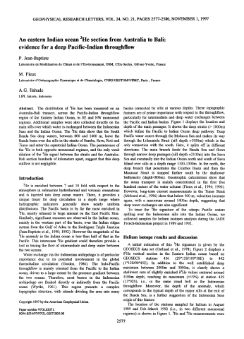 Résumé : The distribution of 3He has been measured on an basins connected by sills at various depths. These topographic Australia-Bali transect, across the Pacific-Indian throughflow features are of prime importance with respect to the throughflow, region of the Eastern Indian Ocean, in SE and NW monsoonal regimes. Additional samples were also collected directly on the main sills over which water is exchanged between the Indonesian Seas and the Indian Ocean. The 3He data show that the South Banda Sea deep waters, between 800 and 1400 m, leave the Banda basin over the sills in the straits of Sumba, Savu, Roti and particularly for intermediate and deep water exchanges between the Pacific and Indian basins. Figure 1 displays the location and depth of the main passages. It shows the deep straits (> 1000m) which define the Pacific to Indian Ocean deep pathway. Deep Pacific water enters through the Molucca Sea and makes its way through the Lifamatola Strait (sill depth •1950m) which is the Timor and enter the equatorial Indian Ocean. The permanence of only connection with the south. Here, it splits off in different the 3He in both opposite monsoonal regimes, and the only weak dilution of the 3He signal between the straits and the Australia-Bali section hundreds of kilometers apart, suggest that this deep outflow is not negligible.