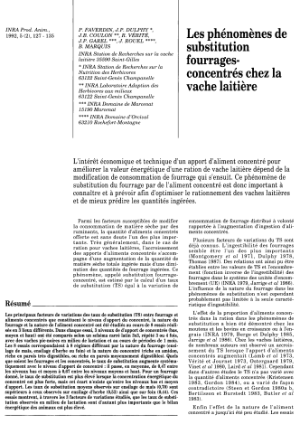 Résumé : Les principaux facteurs de variations des taux de substitution (TS) entre fourrage et aliments concentrés que constituent le niveau d’apport du concentré, la nature du fourrage et la nature de l’aliment concentré ont été étudiés au cours de 8 essais réalisés en 3 lieux différents. Dans chaque essai, 3 niveaux de d’apport de concentrés (bas, moyen et haut) ont été comparés selon un schéma carré latin 3x3, répété 3 ou 4 fois, avec des vaches pie-noires en milieu de lactation et au cours de périodes de 1 mois. Les 8 essais correspondaient à 8 régimes différant par la nature du fourrage (ensilage de maïs, ensilage d’herbe ou foin) et la nature du concentré (riche en amidon, riche en parois très digestibles, ou riche en parois moyennement digestibles). Quels que soient les fourrages et les concentrés, le taux de substitution augmente systématiquement avec le niveau d’apport de concentré : il passe, en moyenne, de 0,47 entre les niveaux bas et moyen à 0,67 entre les niveaux moyens et haut. Pour un fourrage donné, le taux de substitution est plus élevé lorsque la concentration énergétique du concentré est plus forte, mais cet écart n’existe qu’entre les niveaux bas et moyen d’apport. Les taux de substitution moyens observés sur ensilage de maïs (0,70) sont supérieurs à ceux observés sur ensilage d’herbe (0,53) ainsi que sur foin (0,44). Ces essais montrent, à travers les 3 facteurs de variations étudiés, que les taux de substitution observés en milieu de lactation sont d’autant plus importants que le bilan énergétique des animaux est plus élevé.