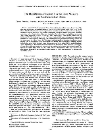 Résumé : Almost a decade after the Geochemical Ocean Sections Study Indian Expedition, the new deep 3He data from the INDIGO program give a further insight into the distribution of this tracer in the Indian Ocean. This distribution exhibits some major features related on one hand to a hydrothermal 3He input in the Gulf of Aden and on the Mid-Indian Ocean Ridge, and on the other to the origin of the water masses and to the characteristics of the deep circulation. The main pattern is a significant north-south 3He gradient, with deep waters of the southern ocean showing 83He values around 8-9% due to the influence of the Atlantic deep waters poor in 3He and relatively high values in the northern and central regions (15% to 18% between 2000 m and 3000 m depth) originating from the hydrothermal activity. In the easternmost part of the basin, the 3He values exhibit a significant increase at shallower depths (around 1000 m) probably due to the Pacific water flow through the Indonesian sills, whereas the data in the Indian sector of the Antarctic ocean show a maximum of the order of 10%, south of the Polar Front, interpreted as showing the presence of the Pacific deep waters in the Antarctic Circumpolar Current. These different aspects are summarized by mapping the horizontal distribution of the 83He maxima all over the Indian basin. This map points out some characteristics of the deep circulation but also stresses the need for further measurements in order to clarify the description of this tracer in several key areas.