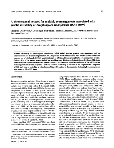 Résumé : Genetic instability in Strepfomyces ambofaciens DSM 40697 involves genomic rearrangements such as amplifications and deletions of particular DNA sequences. Most amplifications were located in two amplifiable regions, one of which, called AUD6 (amplifiable unit of DNA no. 6) was revealed to be a rearrangement hotspot. Indeed, 30% of the mutant strains studied had amplifications, deletions or both at the AUD6 locus. This locus contains several reiterations which are specific to this AUD. Moreover, one of the endpoints of the AUD6 shows homology with an internal sequence. Deletions occurred exclusively at one side of the amplified DNA sequence (ADS) and removed part of the proximal copy of this ADS, leading to the conclusion that multiple rearrangements can occur at this AUD locus.