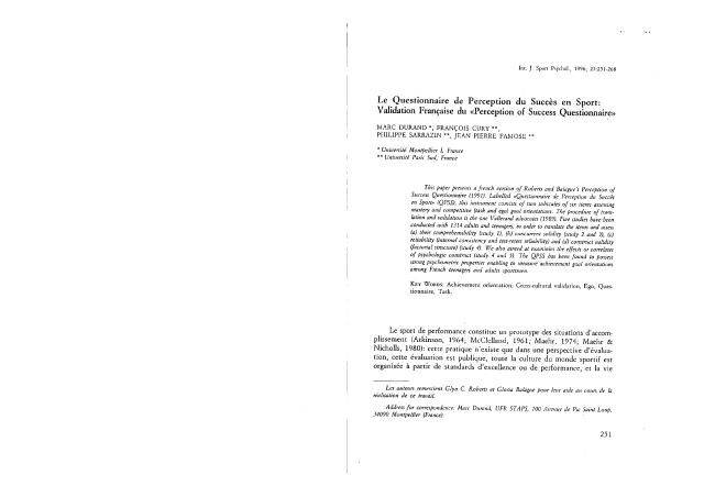 Le Questionnaire de Perception du Succès en Sport: Validation française du "Perception of Success Questionnaire.