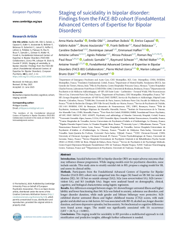 - Auteurs : Anna Maria AuxiliaEmilie OliéJonathan DuboisEnrico CapuzziValérie AubinBruno AouizerateFrank BellivierRaoul BelzeauxCaroline DubertretDominique JanuelEmmanuel HaffenAntoine LefrereAgnès PelletierMircea PolosanRoman ReyP. RouxLudovic SamalinRaymund SchwanMichel WalterAntoine YrondiPierre-Michel LlorcaMarion LeboyerB EtainPhilippe Courtet