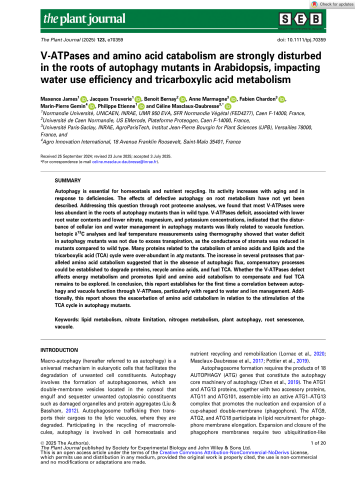 V‐ATPases and amino acid catabolism are strongly disturbed in the roots of autophagy mutants in Arabidopsis, impacting water use efficiency and tricarboxylic acid metabolism