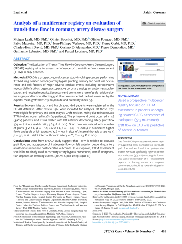 Résumé : OBJECTIVE: The Evaluation of Transit-Time Flow in Coronary Artery Disease Surgery (EFCAD) registry aims to assess the influence of transit-time flow measurement (TTFM) in daily practice. METHODS: EFCAD is a prospective, multicenter study involving 9 centers performing TTFM during isolated coronary artery bypass grafting. Primary end point was occurrence and risk factors of major adverse cardiac events, including perioperative myocardial infarction, urgent postoperative coronary angiogram and/or revascularization, and hospital mortality. Secondary end points were rate of graft revision during surgery and factors affecting graft flow. We respected the limit values set by the experts: mean graft flow >15 mL/minute and pulsatility index ≤5. RESULTS: Between May 2017 and March 2021, 1616 patients were registered in the EFCAD database. After review, 1414 were included for analyses. Of those, 1176 were eligible for primary end point analysis. Graft revision, mainly due to inadequate TTFM values, occurred in 2% (29 patients). The primary end point occurred in 46 (3.9%) patients, and it was related with left anterior descending artery graft flow ≤15 mL/minute (odds ratio, 3.64; P < .001). Graft flow was related with number of grafts (3 vs 1-2, β = -1.6; 4-6 vs 1-2, β = -4.1; P < .001; β > 0 indicates higher flow), and graft origin (aorta vs Y, β = 9.2; in situ left internal thoracic artery vs Y, β = 3.2; in situ right internal thoracic artery vs Y, β = 2.3; P < .001). CONCLUSIONS: Data from EFCAD study suggest that TTFM is reliable to evaluate graft flow, and acceptance of inadequate flow on left anterior descending artery anastomosis influence postoperative outcomes. In our opinion, TTFM assessment should be routinely used in coronary artery bypass procedures, even if interpretation depends on learning curves.