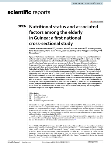Résumé : Abstract Aging of the Guinean population is a public health concern for the coming years, and the nutritional status of older people is virtually unknown. We also know that this population is growing and that undernutrition and obesity can affect the health of older adults. This study aimed to assess the nutritional status of older people in the general population of Guinea and its associated factors. A representative cross-sectional survey was conducted using sociodemographic, clinical, and anthropometric data (weight and height). Oral status was assessed by using the University of Nebraska Oral Status Scale. Visual acuity was assessed using the Monoyer scale. The standardized prevalence ratio (SPR) of the nutritional status was calculated for each region. The sample included 1698 subjects with a mean BMI of 22.6 ± 4.3 kg/m 2 . A total of 50.3% had impaired oral status and 20.3% had moderately to severely impaired visual acuity. The prevalence of undernutrition was 14.4% and of obesity 5.7%. Differences in the prevalence of nutritional status were found between regions, with an SPR > 1 for undernutrition in the Labé region (SPR 1.9, 95% CI = 1.5–2.5) and for obesity in the Conakry and Kindia regions (SPR of 2.90, 95% CI = 2.0–4.05 and 2.32, 95% CI = 1.5–3.3, respectively). In Guinea, The prevalence of nutritional disorders was approximately 20%. Screening and management of the health and nutritional status of older adults should be a national priority, and management should be adapted to each region of the country.