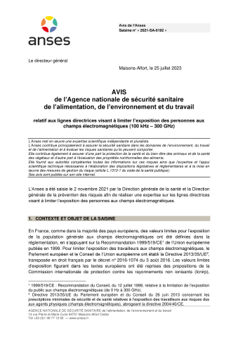 Avis de l'Anses relatif aux lignes directrices visant à limiter l’exposition des personnes aux champs électromagnétiques (100 kHz – 300 GHz)
