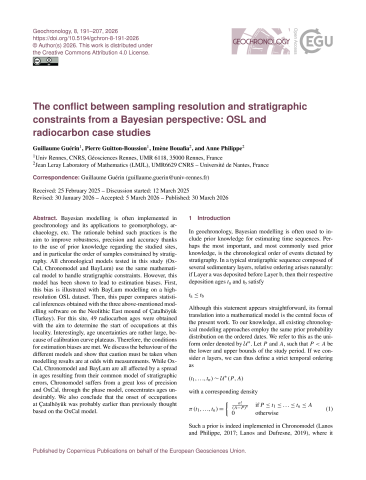 Résumé : Bayesian modelling is often implemented in geochronology and its applications to geomorphology, archaeology, etc. The rationale behind such practices is the aim to improve robustness, precision and accuracy thanks to the use of prior knowledge regarding the studied sites, and in particular the order of samples constrained by stratigraphy. All chronological models tested in this study (Ox-Cal, Chronomodel and BayLum) use the same mathematical model to handle stratigraphic constraints. However, this model has been shown to lead to estimation biases. First, this bias is illustrated with BayLum modelling on a highresolution OSL dataset. Then, this paper compares statistical inferences obtained with the three above-mentioned modelling software on the Neolithic East mound of Çatalhöyük (Turkey). For this site, 49 radiocarbon ages were obtained with the aim to determine the start of occupations at this locality. Interestingly, age uncertainties are rather large, because of calibration curve plateaus. Therefore, the conditions for estimation biases are met. We discuss the behaviour of the different models and show that caution must be taken when modelling results are at odds with measurements. While Ox-Cal, Chronomodel and BayLum are all affected by a spread in ages resulting from their common model of stratigraphic errors, Chronomodel suffers from a great loss of precision and OxCal, through the phase model, concentrates ages undesirably. We also conclude that the onset of occupations at Çatalhöyük was probably earlier than previously thought based on the OxCal model.