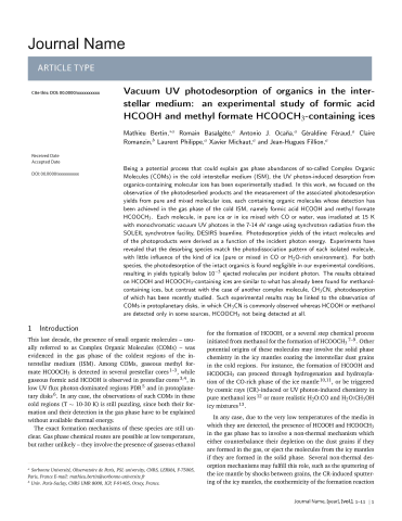 Résumé : Being a potential process that could explain gas phase abundances of so-called Complex Organic Molecules (COMs) in the cold interstellar medium (ISM), the UV photon-induced desorption from organics-containing molecular ices has been experimentally studied. In this work, we focused on the observation of the photodesorbed products and the measurement of the associated photodesorption yields from pure and mixed molecular ices, each containing organic molecules whose detection has been achieved in the gas phase of the cold ISM, namely formic acid HCOOH and methyl formate HCOOCH3. Each molecule, in pure ice or in ice mixed with CO or water, was irradiated at 15 K with monochromatic vacuum UV photons in the 7-14 eV range using synchrotron radiation from the SOLEIL synchrotron facility, DESIRS beamline. Photodesorption yields of the intact molecules and of the photoproducts were derived as a function of the incident photon energy. Experiments have revealed that the desorbing species match the photodissociation pattern of each isolated molecule, with little influence of the kind of ice (pure or mixed in CO or H2O-rich environment). For both species, the photodesorption of the intact organics is found negligible in our experimental conditions, resulting in yields typically below 10E-5 ejected molecules per incident photon. The results obtained on HCOOH and HCOOCH3-containing ices are similar to what has already been found for methanol-containing ices, but contrast with the case of another complex molecule, CH3CN, photodesorption of which has been recently studied. Such experimental results may be linked to the observation of COMs in protoplanetary disks, in which CH3CN is commonly observed whereas HCOOH or methanol are detected only in some sources, HCOOCH3 not being detected at all.