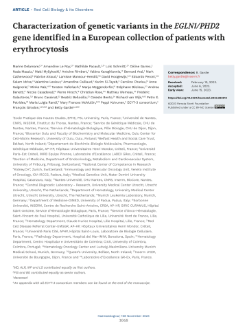Résumé : Hereditary erythrocytosis is a rare hematologic disorder characterized by an excess of red blood cell production. Here we describe a European collaborative study involving a collection of 2,160 patients with erythrocytosis sequenced in ten different laboratories. We focused our study on the EGLN1 gene and identified 39 germline missense variants including one gene deletion in 47 probands. EGLN1 encodes the PHD2 prolyl 4-hydroxylase, a major inhibitor of hypoxia-inducible factor. We performed a comprehensive study to evaluate the causal role of the identified PHD2 variants: (i) in silico studies of localization, conservation, and deleterious effects; (ii) analysis of hematologic parameters of carriers identified in the UK Biobank; (iii) functional studies of the protein activity and stability; and (iv) a comprehensive study of PHD2 splicing. Altogether, these studies allowed the classification of 16 pathogenic or likely pathogenic mutants in a total of 48 patients and relatives. The in silico studies extended to the variants described in the literature showed that a minority of PHD2 variants can be classified as pathogenic (36/96), without any differences from the variants of unknown significance regarding the severity of the developed disease (hematologic parameters and complications). Here, we demonstrated the great value of federating laboratories working on such rare disorders in order to implement the criteria required for genetic classification, a strategy that should be extended to all hereditary hematologic diseases.