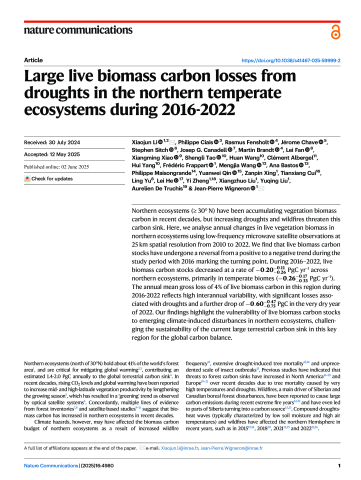 - Auteurs : Xiaojun LiPhilippe CiaisRasmus FensholtJérôme ChaveStephen SitchJ. CanadellMartin BrandtSassan S SaatchiXiangming XiaoShengli TaoHuan WangClément AlbergelHui YangFrédéric FrappartMengjia WangAna BastosPhilippe MaisongrandeYuanwei QinZanpin XingTianxiang CuiLing YuLei HeYi ZhengXiangzhuo LiuYuqing LiuAurelien de TruchisWigneron J.-P.