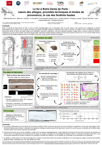 Résumé : Suite à l’incendie de Notre-Dame de Paris, la mise en place d’échafaudages pour la restauration offre un accès unique à des endroits de la cathédrale qui étaient inaccessibles jusqu’à présent. Ceci a permis de révéler une grande diversité d’usages du mobilier ferreux dans la structure de l’édifice. Un relevé systématique est en cours dans le cadre des travaux de thèse sur les métaux ferreux du monument. Le caractère quasi exhaustif d’un tel inventaire est une première pour l’édifice, dont un des principaux et seuls relevés des armatures en fer remonte aux travaux de Viollet-le-Duc (Viollet-le-Duc, 1858). Mais c’est également un nouveau regard porté sur une cathédrale gothique, car jusqu’`a présent, aucun édifice n’a pu faire l’objet d’un suivi si fin au cours de ses restaurations. Parmi les différents éléments de ce corpus se trouvent des agrafes de fer dans la maçonnerie au niveau des tribunes, des murs gouttereaux, des murs sous les terrasses extérieures ou encore dans des colonnes monolithiques adossées aux bas-côtés de la nef et des chapelles. S’ajoutent à cet inventaire des fers de charpente tels que des clous, des tiges boulonnées et des chevilles clavetées, mais également des crêtes de faîtage, des goujons, ou encore des tirants. Ce poster insistera en particulier sur l’étude des anciennes barres de vitraux des baies hautes de la cathédrale, aujourd’hui supprimées, mais dont subsistent quelques vestiges dans le meneau central des fenêtres. Ces barres transversales, mesurant à l’origine plusieurs mètres de long et d’une section d’environ 3,5 x 4 cm, sont des objets ferreux n’ayant jamais été étudiés auparavant dans un tel édifice car ils sont, le plus souvent, rarement accessibles. Treize échantillons ont été prélevés sur site pour analyses, ainsi que trois éléments entiers sur des pièces destinées à être remplacés. Les premières études métallographiques (attaque Nital, observations macroscopiques et microscopiques) permettent de nous éclairer, en particulier, sur la mise en forme de ce mobilier ferreux, mais aussi sur la qualité de la production métallique. L’étude des inclusions de scories au Microscope Electronique à Balayage en Spectrométrie EDS (Dillmann and L’Héritier, 2007) et l’analyse des éléments traces par LA-ICP-MS (L’Héritier et al., 2020) permettent de préciser les filières techniques et les pratiques opératoires utilisées pour la production du fer et dans la mise en œuvre des barres de vitraux. On peut notamment se questionner sur les méthodes de procédés direct et indirect, mais aussi sur la problématique du recyclage, omniprésente sur les chantiers de construction. En parallèle, l’analyse en éléments traces de scories provenant de différents sites métallurgiques issus de plusieurs secteurs d’Île-de-France (Brie française, sud de la forêt de Rambouillet/Hurepoix, est de la vallée de Chevreuse) jusqu’alors non étudiés chimiquement, nous permet de constituer un inventaire inédit des signatures chimiques de la région de sites susceptibles d’avoir approvisionné Notre-Dame. La comparaison avec la composition des inclusions des armatures métalliques mesurée par LA-ICP-MS contribuera à tester et discuter ces hypothèses de provenance.