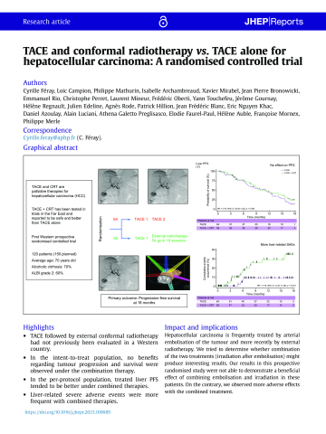 Résumé : Background & aims: Transcatheter arterial chemoembolisation (TACE) is recommended for patients with hepatocellular carcinoma devoid of macrovascular invasion or extrahepatic spread but not eligible for curative therapies. We compared the efficacy and safety of the combination of a single TACE and external conformal radiotherapy (CRT) vs. classical TACE.Methods: TACERTE was an open-labelled, randomised controlled trial with a 1:1 allocation rate to two or three TACE (arm A) or one TACE + CRT (arm B). Participants had a mean age of 70 years, and 86% were male. The aetiology was alcohol in 85%. The primary endpoint was liver progression-free survival (PFS) in the intention-to-treat population. The typical CRT schedule was 54 Gy in 18 sessions of 3 Gy.Results: Of the 120 participants randomised, 64 were in arm A and 56 in arm B; 100 participants underwent the planned schedule and defined the 'per-protocol' group. In intention-to-treat participants, the liver PFS at 12 and 18 months were 59% and 19% in arm A and 61% and 36% in arm B (hazard ratio [HR] 0.69; 95% CI 0.40-1.18; p = 0.17), respectively. In the per-protocol population, treated liver PFS tended to be better in arm B (HR 0.61; 95% CI 0.34-1.06; p = 0.081) than in arm A. Liver-related grade III-IV adverse events were more frequent in arm B than in arm A. Median overall survival reached 30 months (95% CI 23-35) in arm A and 22 months (95% CI 15.7-26.2) in arm B.Conclusions: Although TACE + CRT tended to improve local control, this first Western randomised controlled trial showed that the combined strategy failed to increase PFS or overall survival and led more frequently to liver-related adverse effects.Impact and implications: Hepatocellular carcinoma is frequently treated by arterial embolisation of the tumour and more recently by external radiotherapy. We tried to determine whether combination of the two treatments (irradiation after embolisation) might produce interesting results. Our results in this prospective randomised study were not able to demonstrate a beneficial effect of combining embolisation and irradiation in these patients. On the contrary, we observed more adverse effects with the combined treatment.