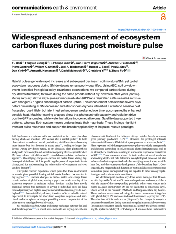 Résumé : Rainfall pulses generate rapid increases and subsequent declines in soil moisture (SM), yet global ecosystem responses during SM dry-downs remain poorly quantified. Using 6502 soil dry-down events identified from global eddy-covariance observations, we compared carbon fluxes during dry-downs (treatment) to fluxes during the same periods without dry-downs in other years (control). During early dry-downs days, gross primary production (GPP) and respiration both exceeded controls, with stronger GPP gains enhancing net carbon uptake. This enhancement persisted for several days before diminishing as SM decreased and atmospheric dryness intensified. Latent and sensible heat fluxes also rose initially, but latent heat enhancement weakened over time, accompanied by enhanced sensible heat. Machine-learning analyses show that photosynthetic capacity and radiation drive positive GPP anomalies, while water limitations induce negative ones. Satellite data supported these patterns, whereas Earth system models underestimate their magnitude. These findings highlight transient pulse responses and support the broader applicability of the pulse-reserve paradigm.