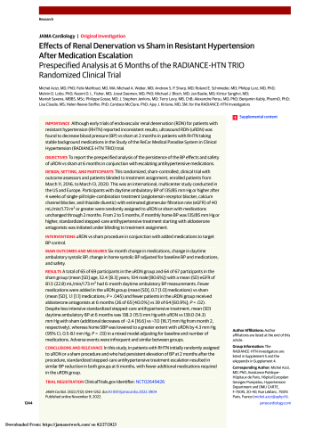 Résumé : Importance Although early trials of endovascular renal denervation (RDN) for patients with resistant hypertension (RHTN) reported inconsistent results, ultrasound RDN (uRDN) was found to decrease blood pressure (BP) vs sham at 2 months in patients with RHTN taking stable background medications in the Study of the ReCor Medical Paradise System in Clinical Hypertension (RADIANCE-HTN TRIO) trial. Objectives To report the prespecified analysis of the persistence of the BP effects and safety of uRDN vs sham at 6 months in conjunction with escalating antihypertensive medications. Design, Setting, and Participants This randomized, sham-controlled, clinical trial with outcome assessors and patients blinded to treatment assignment, enrolled patients from March 11, 2016, to March 13, 2020. This was an international, multicenter study conducted in the US and Europe. Participants with daytime ambulatory BP of 135/85 mm Hg or higher after 4 weeks of single-pill triple-combination treatment (angiotensin-receptor blocker, calcium channel blocker, and thiazide diuretic) with estimated glomerular filtration rate (eGFR) of 40 mL/min/1.73 m 2 or greater were randomly assigned to uRDN or sham with medications unchanged through 2 months. From 2 to 5 months, if monthly home BP was 135/85 mm Hg or higher, standardized stepped-care antihypertensive treatment starting with aldosterone antagonists was initiated under blinding to treatment assignment. Interventions uRDN vs sham procedure in conjunction with added medications to target BP control. Main Outcomes and Measures Six-month change in medications, change in daytime ambulatory systolic BP, change in home systolic BP adjusted for baseline BP and medications, and safety. Results A total of 65 of 69 participants in the uRDN group and 64 of 67 participants in the sham group (mean [SD] age, 52.4 [8.3] years; 104 male [80.6%]) with a mean (SD) eGFR of 81.5 (22.8) mL/min/1.73 m 2 had 6-month daytime ambulatory BP measurements. Fewer medications were added in the uRDN group (mean [SD], 0.7 [1.0] medications) vs sham (mean [SD], 1.1 [1.1] medications; P = .045) and fewer patients in the uRDN group received aldosterone antagonists at 6 months (26 of 65 [40.0%] vs 39 of 64 [60.9%]; P = .02). Despite less intensive standardized stepped-care antihypertensive treatment, mean (SD) daytime ambulatory BP at 6 months was 138.3 (15.1) mm Hg with uRDN vs 139.0 (14.3) mm Hg with sham (additional decreases of −2.4 [16.6] vs −7.0 [16.7] mm Hg from month 2, respectively), whereas home SBP was lowered to a greater extent with uRDN by 4.3 mm Hg (95% CI, 0.5-8.1 mm Hg; P = .03) in a mixed model adjusting for baseline and number of medications. Adverse events were infrequent and similar between groups. Conclusions and Relevance In this study, in patients with RHTN initially randomly assigned to uRDN or a sham procedure and who had persistent elevation of BP at 2 months after the procedure, standardized stepped-care antihypertensive treatment escalation resulted in similar BP reduction in both groups at 6 months, with fewer additional medications required in the uRDN group. Trial Registration ClinicalTrials.gov Identifier: NCT02649426