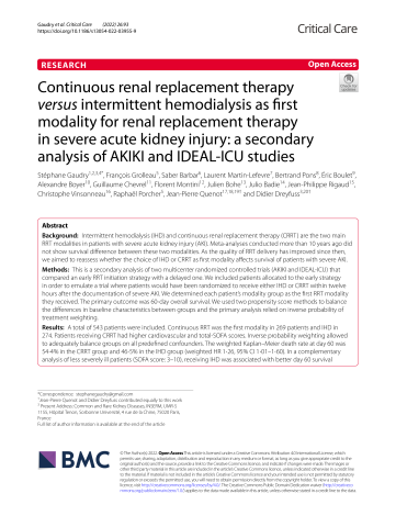 Continuous renal replacement therapy versus intermittent hemodialysis as first modality for renal replacement therapy in severe acute kidney injury: a secondary analysis of AKIKI and IDEAL-ICU studies
