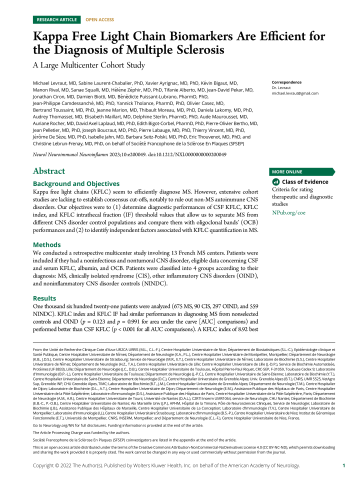 Kappa Free Light Chain Biomarkers Are Efficient for the Diagnosis of Multiple Sclerosis: A Large Multicenter Cohort Study