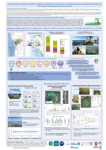 Résumé : Rising greenhouse gas emissions are causing increasing worldwide impacts and changes on climate patterns, sea level, food production, human lives and livelihoods. Maintaining or improving the ability of coastal aquatic ecosystems and oceans to remove CO2 from the atmosphere is a crucial aspect for climate mitigation. The vegetated coastal ecosystems are able to catch and to sequestrate carbon, the so-called Blue Carbon. These ecosystems are key exchange zones that mediate the biogeochemical cycles across the continent, the ocean and the atmosphere. Given the importance of these ecosystems in biogeochemical cycles and their sensitivity to natural and anthropogenic pressures, the carbon cycle within and between compartments (e.g. pelagos, benthos…) and across the interfaces (e.g. atmosphere, ocean…) need to be addressed. On a regional scale, in the extended urban area of La Rochelle located on the French Atlantic coast (La Rochelle metropolitan area), lack in situ measurements within the wetlands and littoral zone make very uncertain their role as a sink or a source of CO2 to the atmosphere. We will first present a vast research project “La Rochelle Territoire Zéro Carbone” project (https://www.agglo-larochelle.fr/projet-de-territoire/territoire-zero-carbone), that target the ambition of carbon neutrality in La Rochelle metropolitan area by 2040 through a holistic approach (from measuring CO2 to raising people's awareness and assessing the impact of exogenous natural factors). Second, we will present some first results on the Blue Carbon dynamics within the freshwater and salt marshes, and seagrasses.
