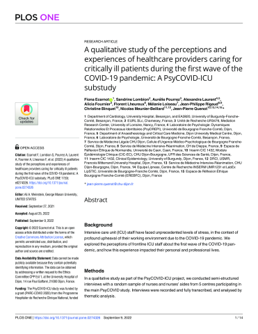 Résumé : Background Intensive care unit (ICU) staff have faced unprecedented levels of stress, in the context of profound upheaval of their working environment due to the COVID-19 pandemic. We explored the perceptions of frontline ICU staff about the first wave of the COVID-19 pandemic, and how this experience impacted their personal and professional lives.