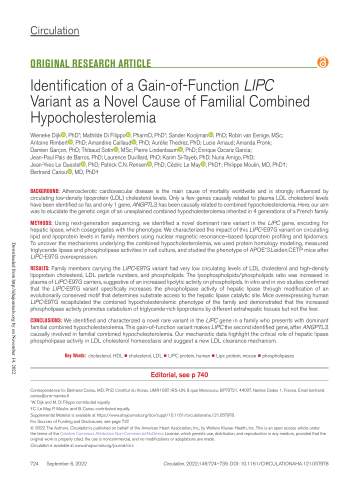 Résumé : BACKGROUND: Atherosclerotic cardiovascular disease is the main cause of mortality worldwide and is strongly influenced by circulating low-density lipoprotein (LDL) cholesterol levels. Only a few genes causally related to plasma LDL cholesterol levels have been identified so far, and only 1 gene, ANGPTL3, has been causally related to combined hypocholesterolemia. Here, our aim was to elucidate the genetic origin of an unexplained combined hypocholesterolemia inherited in 4 generations of a French family. METHODS: Using next-generation sequencing, we identified a novel dominant rare variant in the LIPC gene, encoding for hepatic lipase, which cosegregates with the phenotype. We characterized the impact of this LIPC-E97G variant on circulating lipid and lipoprotein levels in family members using nuclear magnetic resonance-based lipoprotein profiling and lipidomics. To uncover the mechanisms underlying the combined hypocholesterolemia, we used protein homology modeling, measured triglyceride lipase and phospholipase activities in cell culture, and studied the phenotype of APOE*3.Leiden.CETP mice after LIPC-E97G overexpression. RESULTS: Family members carrying the LIPC-E97G variant had very low circulating levels of LDL cholesterol and high-density lipoprotein cholesterol, LDL particle numbers, and phospholipids. The lysophospholipids/phospholipids ratio was increased in plasma of LIPC-E97G carriers, suggestive of an increased lipolytic activity on phospholipids. In vitro and in vivo studies confirmed that the LIPC-E97G variant specifically increases the phospholipase activity of hepatic lipase through modification of an evolutionarily conserved motif that determines substrate access to the hepatic lipase catalytic site. Mice overexpressing human LIPC-E97G recapitulated the combined hypocholesterolemic phenotype of the family and demonstrated that the increased phospholipase activity promotes catabolism of triglyceride-rich lipoproteins by different extrahepatic tissues but not the liver. CONCLUSIONS: We identified and characterized a novel rare variant in the LIPC gene in a family who presents with dominant familial combined hypocholesterolemia. This gain-of-function variant makes LIPC the second identified gene, after ANGPTL3, causally involved in familial combined hypocholesterolemia. Our mechanistic data highlight the critical role of hepatic lipase phospholipase activity in LDL cholesterol homeostasis and suggest a new LDL clearance mechanism.