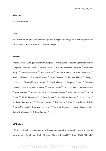 Recommandations pratiques pour le diagnostic et la prise en charge de la fibrose pulmonaire idiopathique – Actualisation 2021. Version intégrale