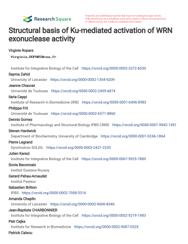 Résumé : Werner (WRN) is the only human RecQ helicase family member with DNA exonuclease activity. WRN promotes genome stability through its functions in DNA replication, repair and telomere maintenance, the deficiency of which presents clinically as Werner syndrome, causing premature aging and cancer predisposition. The main DNA double strand-break sensor Ku70/80 heterodimer (Ku) is a known partner of WRN, which stimulates its nuclease activity. However, the molecular basis of Ku-WRN interplay is currently unknown. Here, we present a high resolution cryo-EM structure of human Ku bound to DNA in complex with the N-terminal WRN exonuclease domain. This structure reveals multiple interaction sites between WRN and the Ku:DNA complex. The catalytic domain of WRN-exo engages with the DNA ends, stabilized by the vWA-like Ku80 domain interacting with the N-terminal APLF-like Ku binding motif (A-KBM) of WRN. Most surprisingly, we visualize the SAP domain of Ku70 stabilized within this complex, and we identify specific contacts mediating this interaction. These interactions were validated by assessing the impact of point mutations on either side of the Ku-WRN interfaces on exonuclease activity with purified recombinant proteins, and on live protein recruitment at biphoton laser-damaged nuclear sites. Finally, we show that disruption of WRN-Ku70 interaction results in aberrant resection of stalled replication forks. Together, we define the architecture of the Ku-WRN exonuclease domain interface and its impact on WRN exonuclease activity, recruitment and replication fork processing.