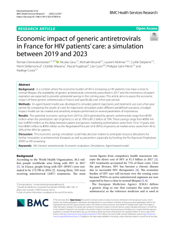 Résumé : Background: In a context where the economic burden of HIV is increasing as HIV patients now have a close to normal lifespan, the availability of generic antiretrovirals commonly prescribed in 2017 and the imminence of patent expiration are expected to provide substantial savings in the coming years. This article aims to assess the economic impact of these generic antiretrovirals in France and specifically over a five-year period. Methods: An agent-based model was developed to simulate patient trajectories and treatment use over a five-year period. By comparing the results of costs for trajectories simulated under different predefined scenarios, a budget impact model can be created and sensitivity analyses performed on several parameters of importance. Results: The potential economic savings from 2019 to 2023 generated by generic antiretrovirals range from €309 million when the penetration rate of generics is set at 10% to €1.5 billion at 70%. These savings range from €984 million to €993 million as the delay between patent and generic marketing authorisation varies from 10 to 15 years, and from €965 million to €993 million as the Negotiated Price per Unit (NPU) of generics at market-entry varies from 40 to 50% of the NPU for patents. Discussion: This economic savings simulation could help decision makers to anticipate resource allocations for further innovation in antiretrovirals therapies as well as prevention, especially by funding the Pre-Exposure Prophylaxis (PrEP) or HIV screening.